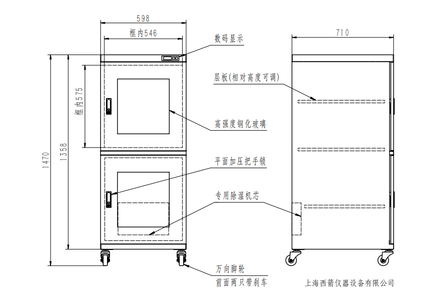 3.防潮箱門玻璃區域選用3.0mm鋼化玻璃,防前傾耳式結構設計。帶平面加壓把手鎖*體化設計,有防盜功能。D部安裝可移動帶剎車腳輪方便移動及固定(防靜電機型腳輪為防靜電)。